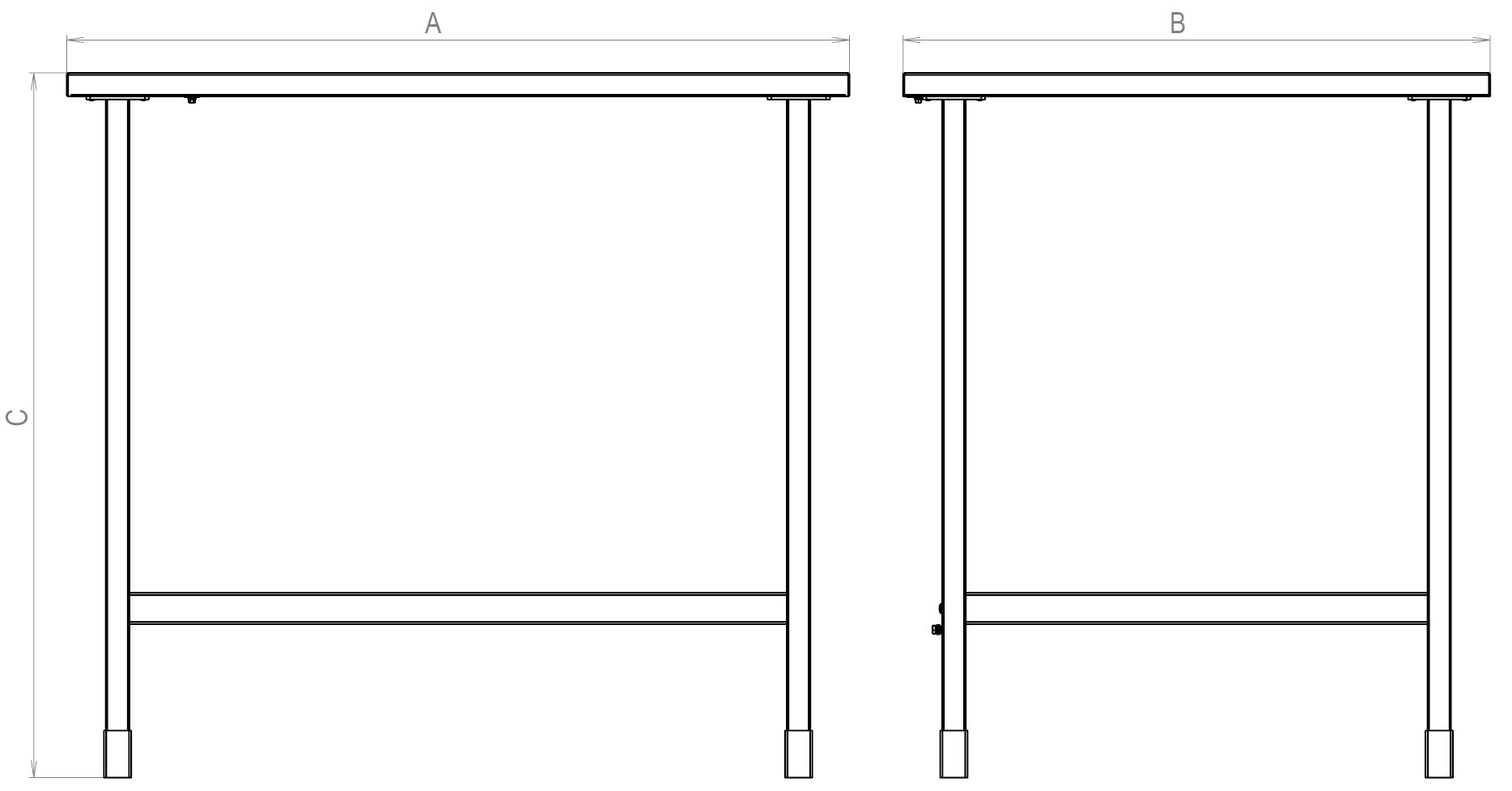 - The frame is composed of H-shaped side legs and reinforcement bolted to the side legs. The legs feature standard adjustable feet allowing to adjust the table height (approx. 30 mm). When assembling two tables, one central leg, instead of two legs, is used for joining the two tables