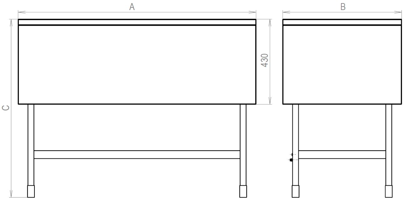 • The frame is composed of H-shaped side legs and reinforcement bolted to the side legs. The legs feature standard adjustable feet allowing to adjust the table height (approx. 30 mm). When assembling two tables, one central leg, instead of two legs, is used for joining the two tables. The sheet covering may be one-sided, two-sided or three-sided.