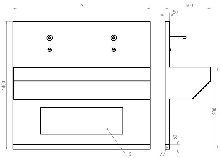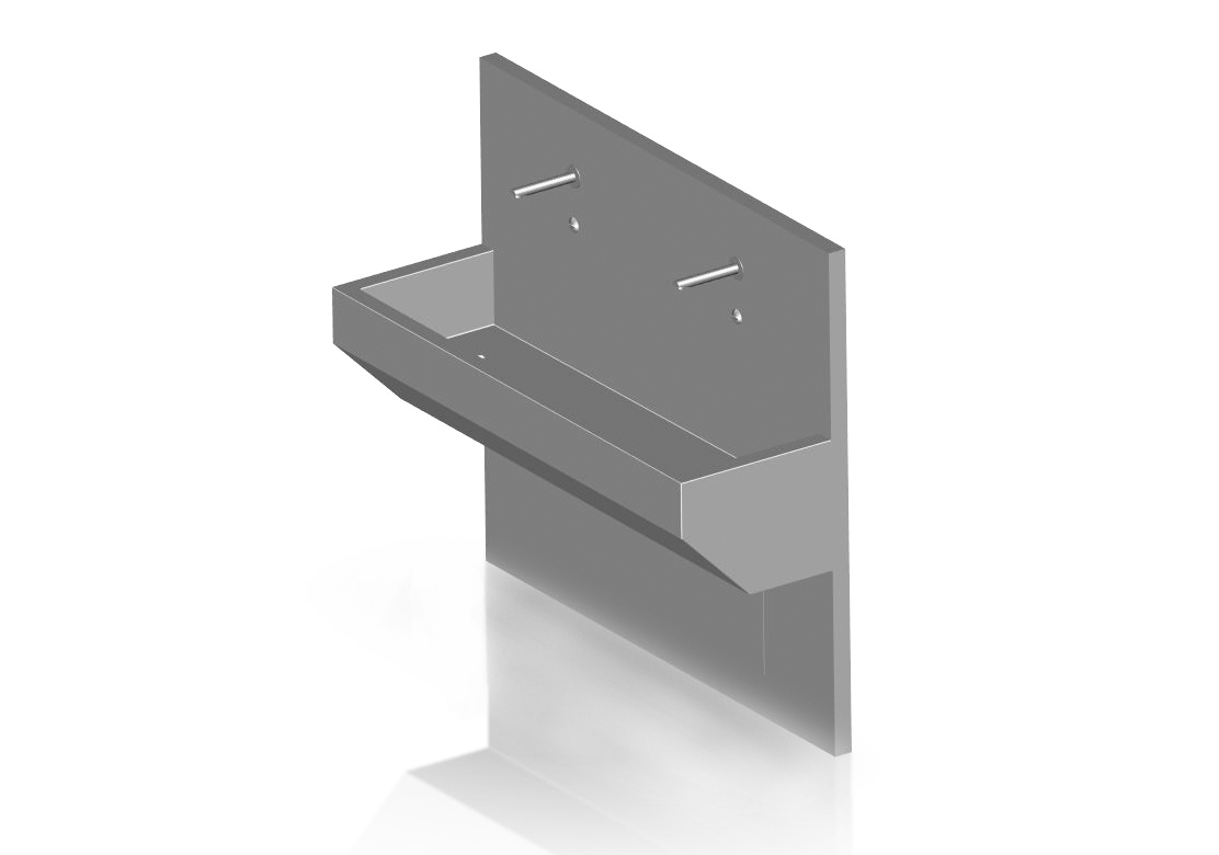 • It is available in the standard widths of 800, 1500, 1850, 2100 and 2400 mm. The wash trough is mounted on a 50 mm high profile. The total post-installation height of the rear wall of the trough is 1400 mm. The trough is situated at a height of 850 mm.