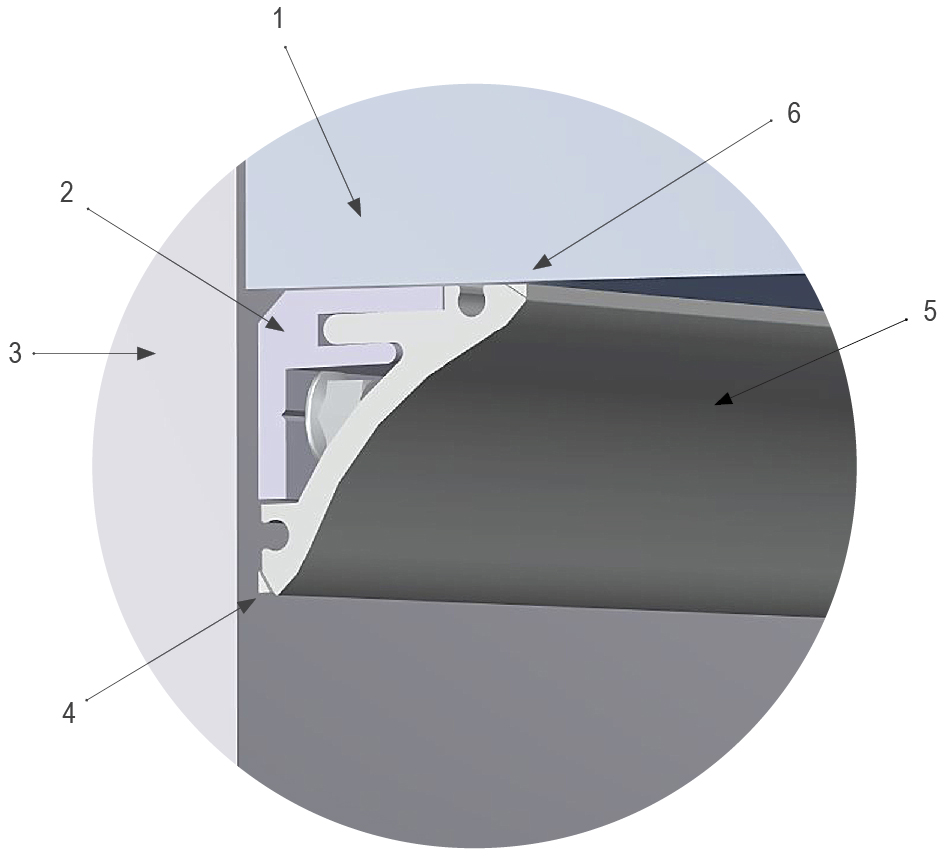 1 - Ceiling; 2 - F - strip; 3 - Partition; 4 - Mastic; 5 - Aluminium coving;