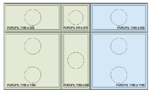 Filtrační nástavce PUROFIL je možno skládat do různých sestav. Pro sestavy se používají filtrační nástavce s filtry o půdorysných rozměrech 570x570, 1180x555 a 1180x1180 mm.